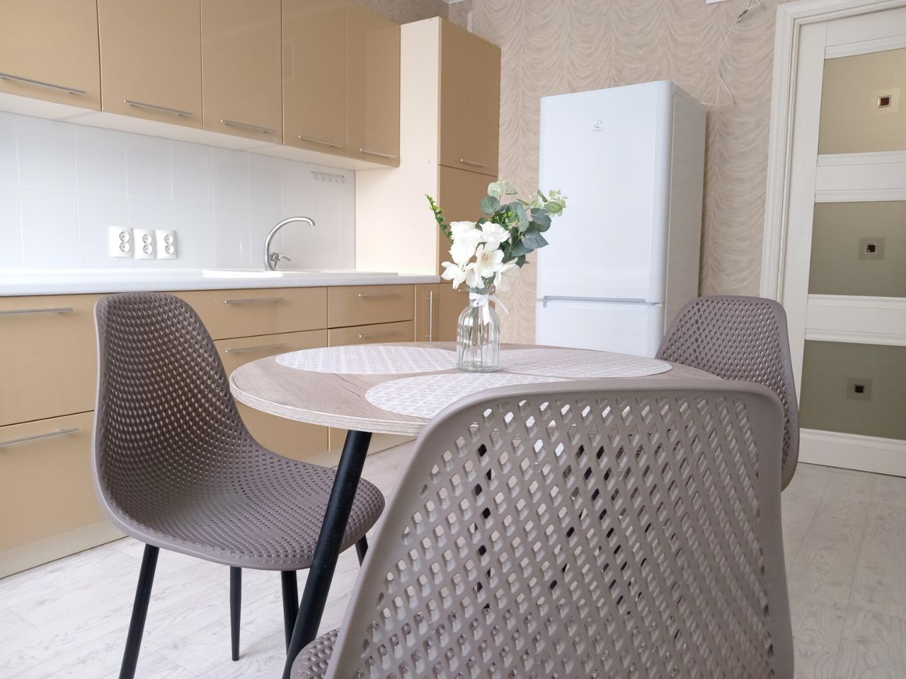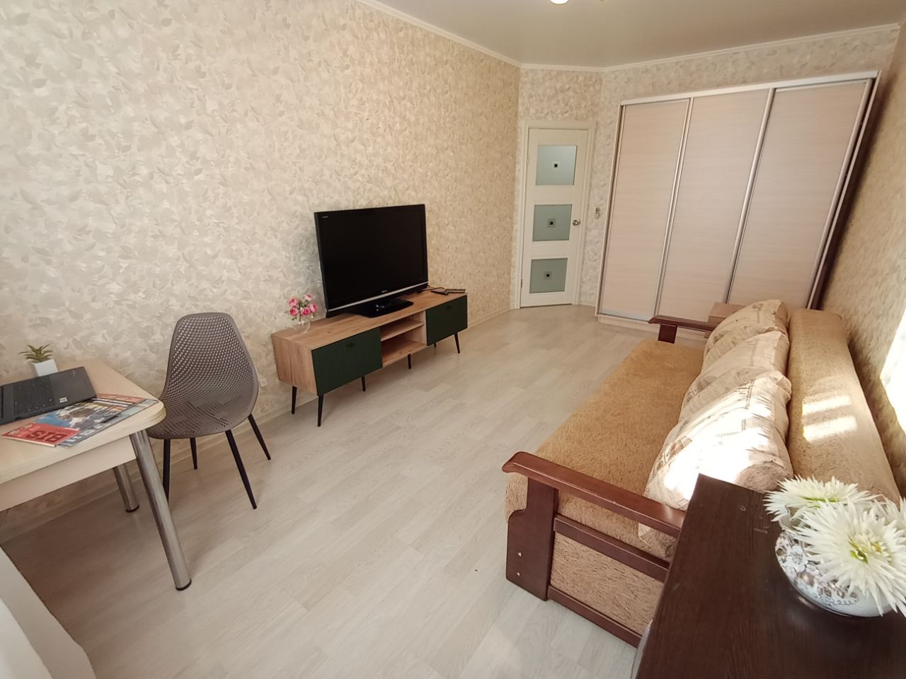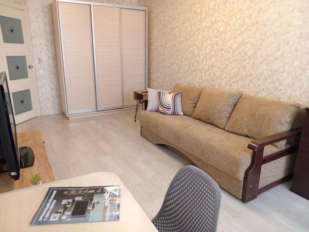 В квартире огромный ТВ 102 диагональ и кабельное ТВ, большой холодильник, сплит, стиральная машина на 7 кг,