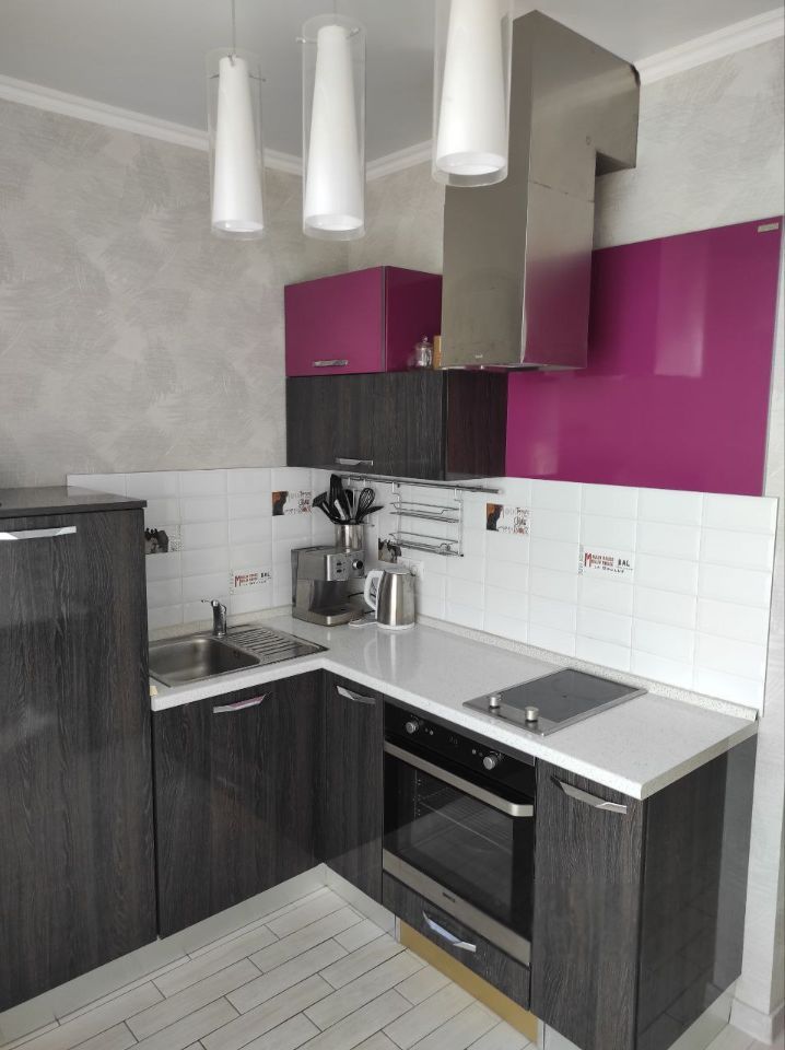 -кухонный гарнитур (встроенный холодильник, двухкомфорочная электрическая плита, духовой шкаф, вытяжка, фильтр для воды, кофемашина). Обеденный раскладной стол.