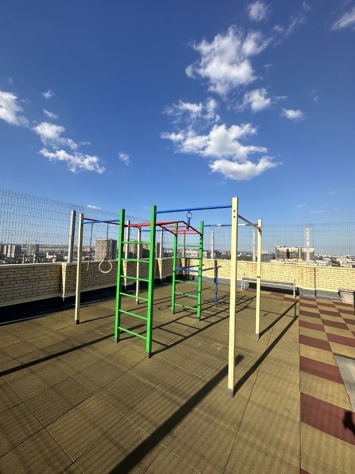 Новый современный дом в самом центре, приличные соседи, в холле 4 лифта с обдувом, высокий этаж, эксплуатируемая кровля (на крыше спортивная площадка, лавочки для отдыха, панорамный вид на город ). Вся необходимая техника в наличии. Сплит и телевизор в каждой комнате. Шкаф купе.