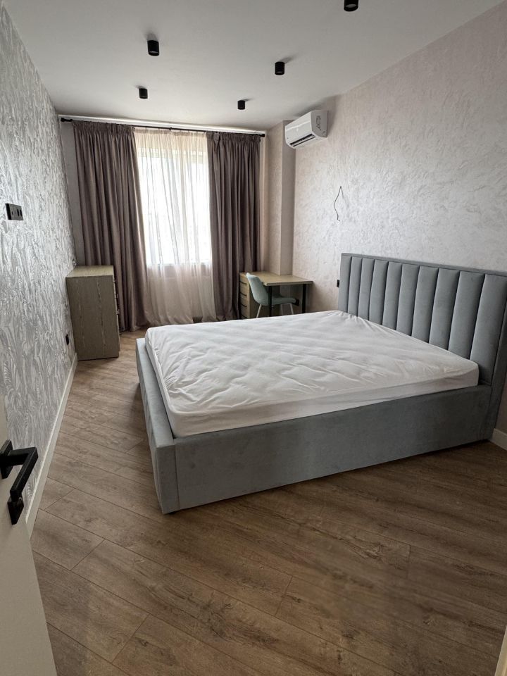 В комнате есть двуспальная кровать с только что купленным матрасом, шкаф-купе, комод, письменный стол, стул, кондиционер.