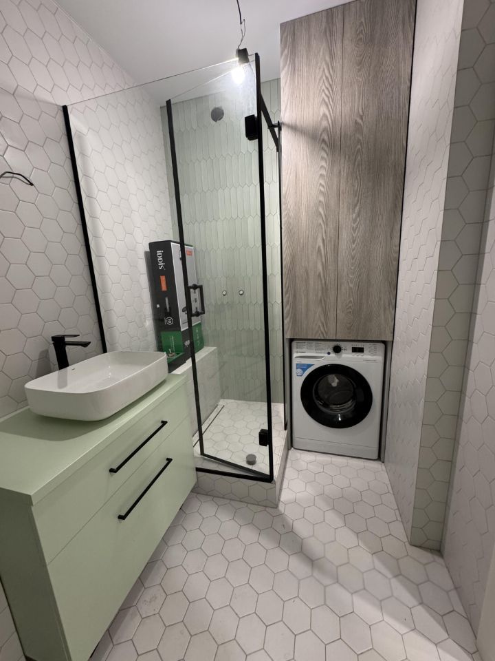 Санузел совмещенный, есть стиральная машина, два шкафа.
