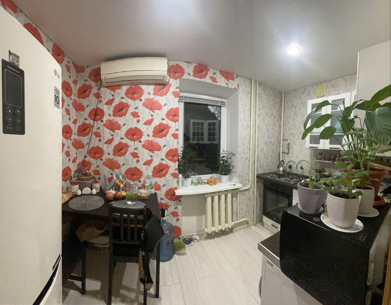 Кухня оборудована всей необходимой техникой: холодильник, плита, микроволновка, духовой шкаф. Есть обеденный стол со стульями.